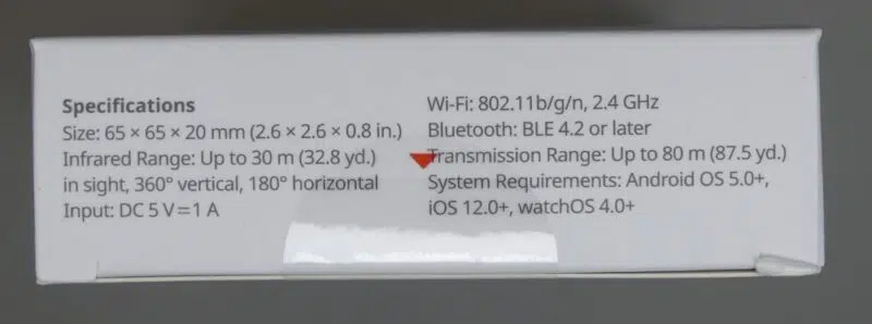 Une nouvelle information apparait, c’est le logo du protocole Matter. Vous le retrouvez sur la 3ème ligne avec la liste des protocoles, mais aussi en bas à droite de cette face de manière plus visible. Sur le dessus de l’emballage, la marque en blanc sur fond rouge.