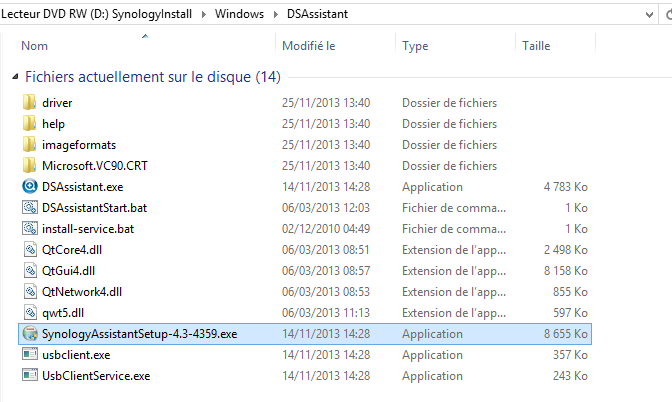 Maintenant que le NAS est prêt à fonctionner, il ne reste plus qu’à le brancher ! On plug donc les connectiques d’alimentation et de réseau, on peut très bien brancher le NAS au niveau réseau directement sur sa box pour y accéder via le réseau ou sur un switch dans le cadre d’un réseau d’entreprise. On notera aussi la possibilité d’y mettre un adaptateur Wifi mais il faut pour cela dans un premier temps installer le DSM. Une fois que le DS213j est branché sur le réseau, on va installer le DSAssistant sur PC via le CD fournis dans la boite, une fois le CD dans le PC, on se dirige dans « Windows » (s’il s’agit de votre OS ;)) puis dans « DSAssistant » pour exécuter « SynologyAssisstantSetup…exe » :
