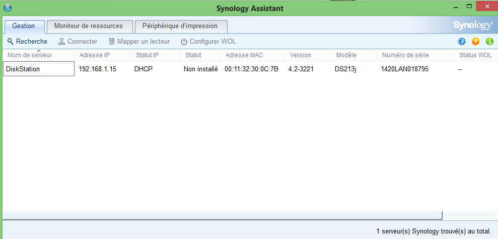 A la fin de l’installation, on pourra lancer le Synology Assistant qui va partir à la recherche de notre nouveau NAS sur le réseau, voici l’affichage que j’ai sur mon réseau :
