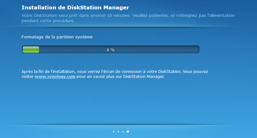 Une fois que ces données seront saisies, il nous suffit d’attendre quelques minutes (une dizaine) pour que DSM s’installe sur notre nouveau NAS ;). Un peu de temps pour se prendre un petit café !