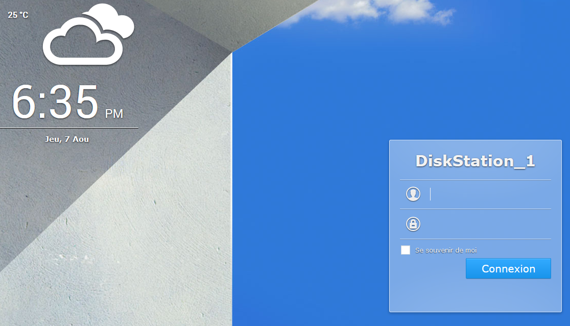 Une fois l’installation terminée, le DS123j va redémarrer (émettant un ou deux « beep » pour nous avertir), on pourra alors, lorsque l’on retournera sur l’interface web de notre NAS, voir cette page d’authentification :