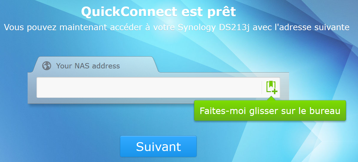 Une fois les informations saisies, on clique sur « Suivant » et le compte va se créer (si votre QuickConnect ID est déjà pris, il va falloir en saisir un autre). Nous aurons ensuite la possibilité de glisser le petit marque page vert sur le bureau pour n’avoir ensuite qu’à cliquer dessus pour accéder à l’interface web de notre NAS (que ce soit depuis Internet ou dans le même réseau que le NAS) :