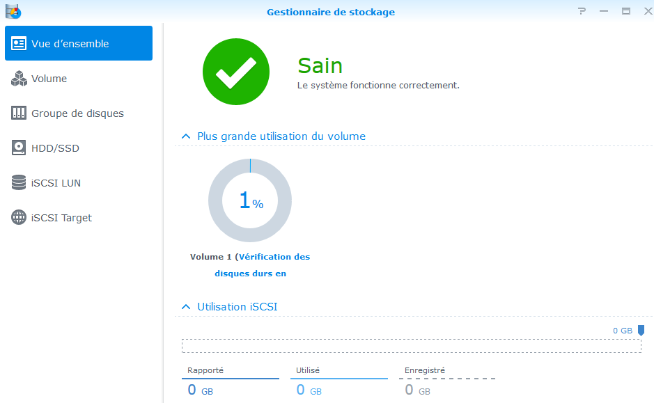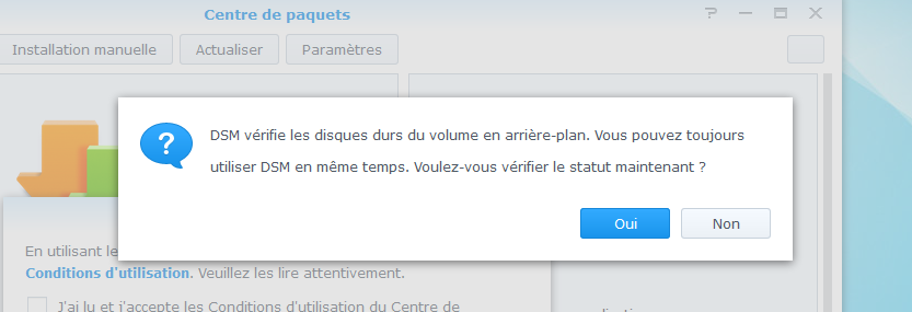 Nous avons également un avertissement nous indiquant que le système va utiliser quelques ressources dans le but de vérifier l’état des disques, le temps de la vérification dépendra de la taille des disques présents mais ne devrait pas gêner l’utilisation du NAS :