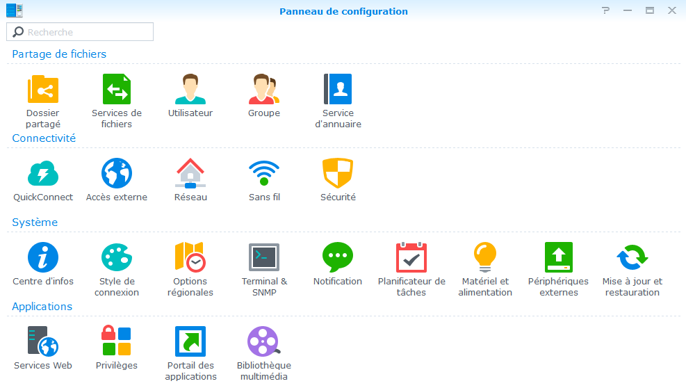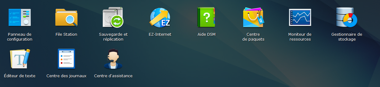 La configuration basique du NAS se trouvera facilement en allant cliquer directement sur les raccourcis bureau mais aussi via le bouton en haut gauche du Bureau web du DSM on aura alors une suite d’icônes dont celui du panneau de configuration :