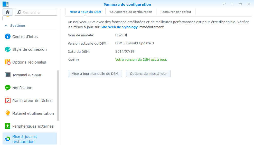 Pendant que nous y sommes, il est judicieux de voir si notre NAS est à jour et de le mettre à jour si besoin, on clique pour cela sur « Mise à jour et restauration » :
