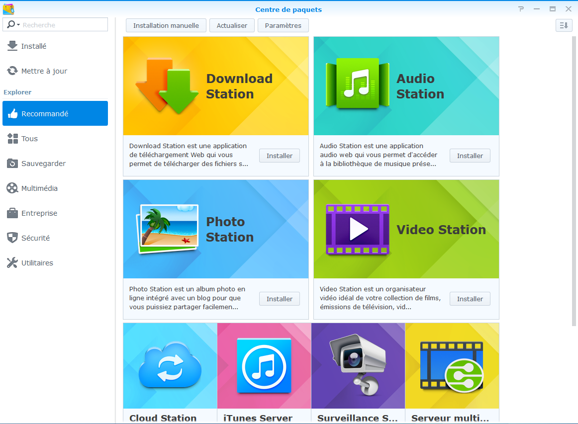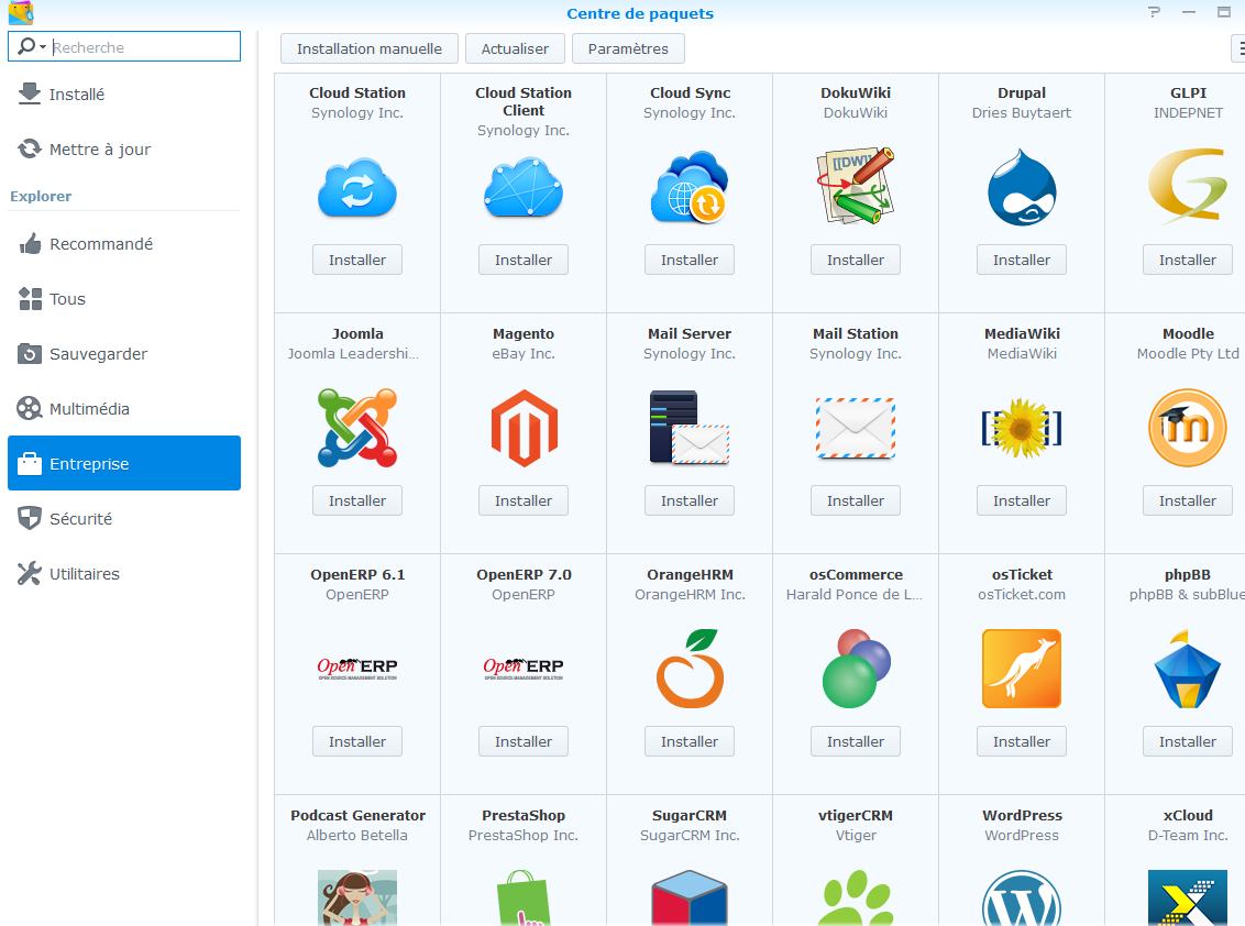 De la même manière, on peut obtenir le centre de paquets qui lui permet d’installer et de gérer les applications optionnelles qu’il est possible de mettre sur notre NAS :