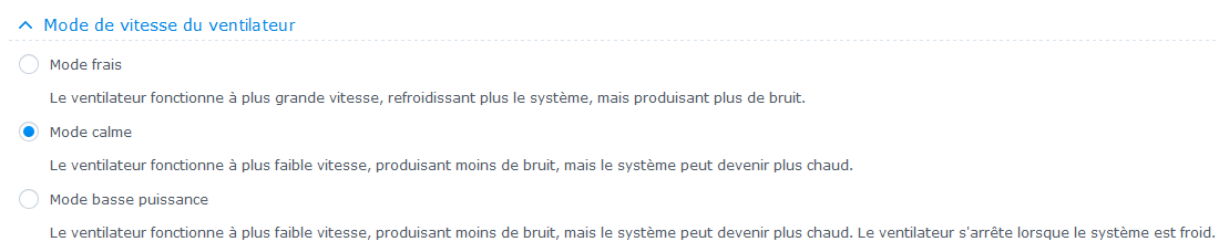 J’oubliais ! Au niveau du bruit que produit le NAS : il est assez discret la plupart du temps, on entend jusque quelques vibrations lors des gros traitements sans que cela soit gênant pour autant, on peut d’ailleurs gérer la vitesse du ventilateur et son mode de refroidissement global :