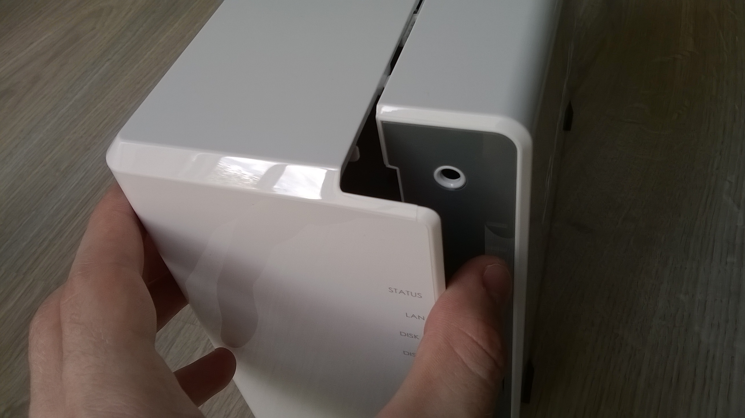 Nous allons maintenant installer nos disques dans le boitier, pour rappel, il s’agit de connecteurs SATA et les réceptacles sont faits pour accueillir deux disques 3"5. Pour installer les disques, il suffit de tirer la partie gauche de la coque vers l’avant du boitier :