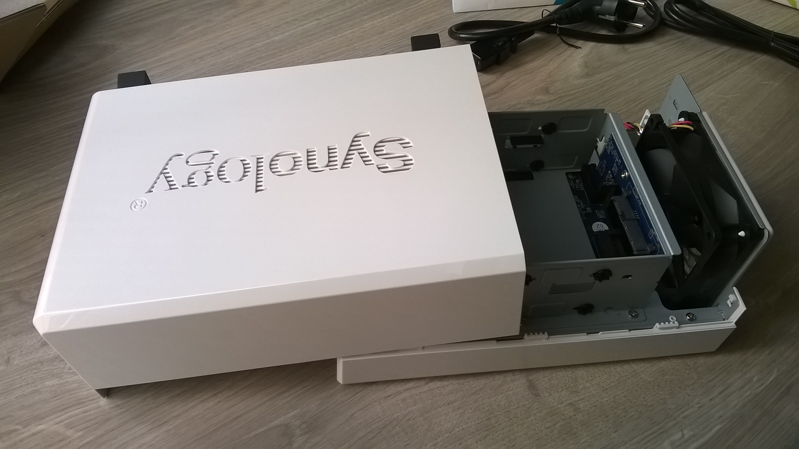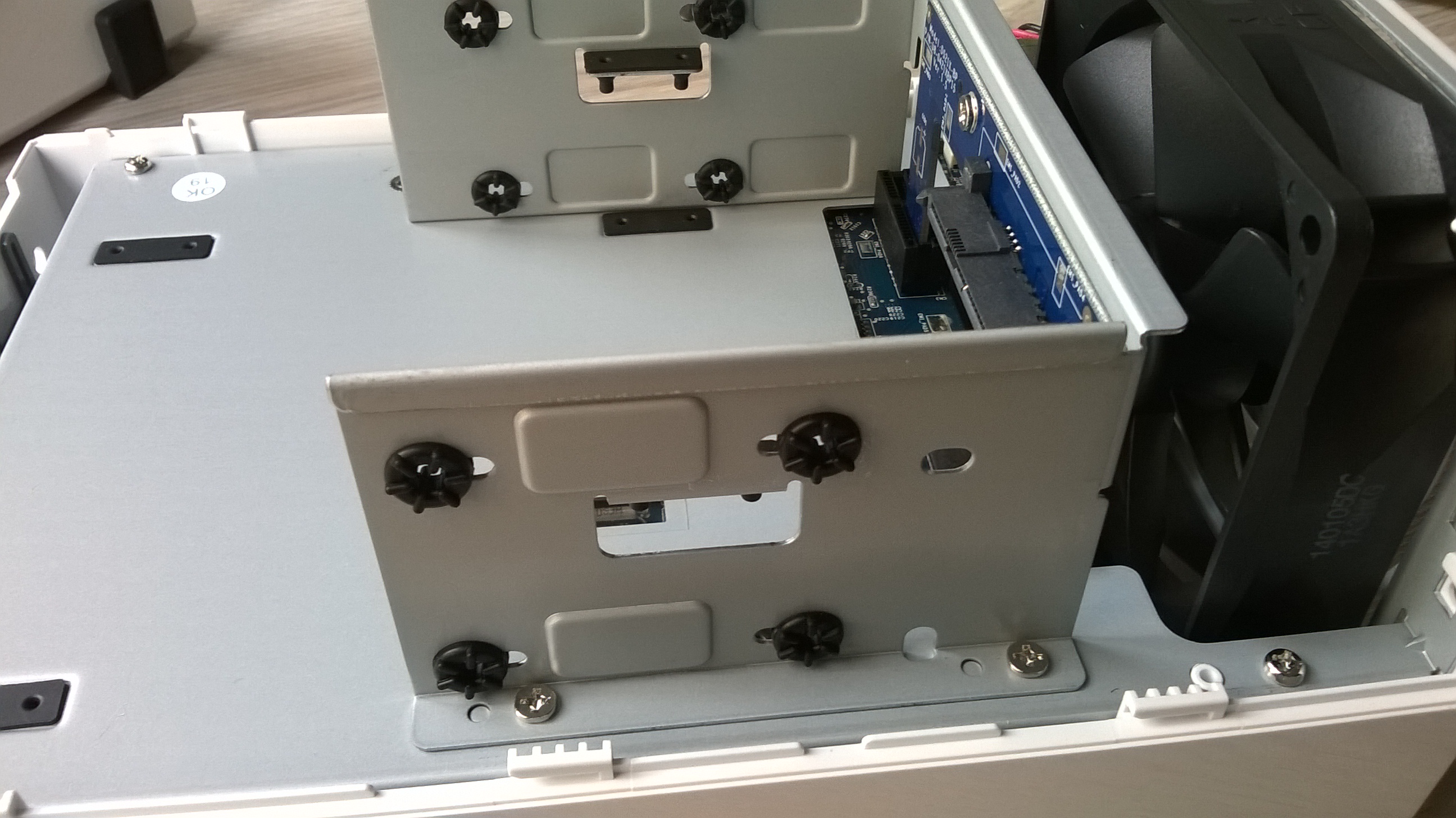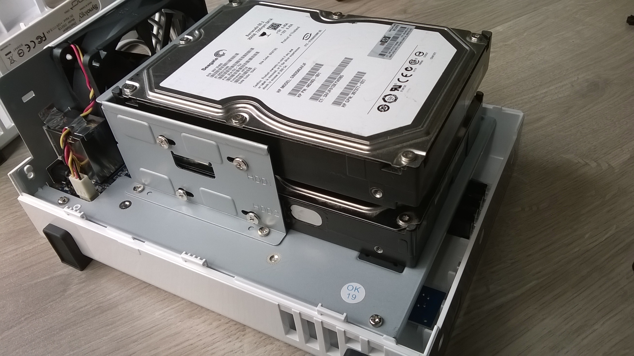 On pourra donc ensuite insérer nos disques l’un au-dessus de l’autre, les disques seront donc à la verticale une fois le NAS mis sur ses pieds :