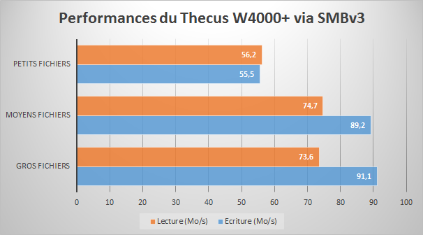 Passons désormais aux performances lors de transfert de fichiers entre un poste de travail et le NAS Thecus, le tout relié en Gigabit Ethernet, via un partage SMB 3.02 créé sur le NAS.