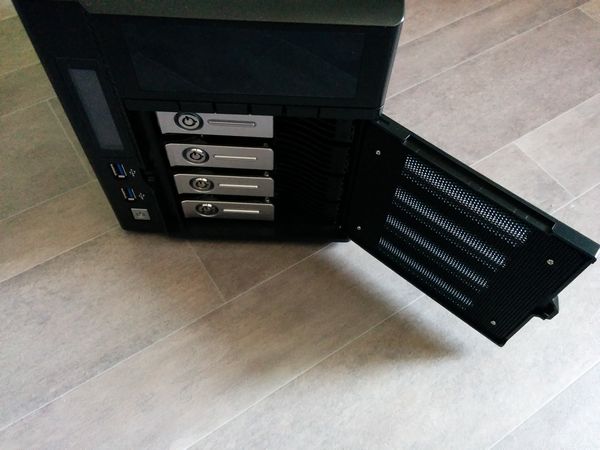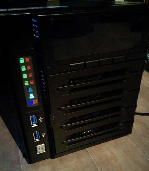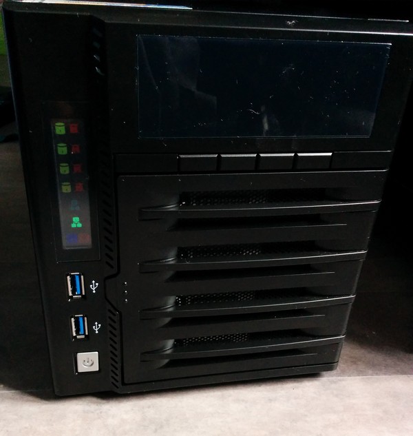 Ce boitier "cubique" en métal noir, est équipé d'une façade en plastique et d'une porte renforcée qui donne accès aux disques durs. Sur la façade, un bouton d'alimentation, deux ports USB et un écran vertical qui affiche différents icônes quant à l'état de chaque disque et de chaque interface réseau, plutôt sympathique. Je regrette toutefois la présence d'un écran en façade qui en fait n'en ai pas un... Sinon, ça aurait était top !