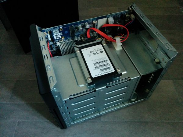 En retirant les deux vis à l'arrière du boitier, on accède à l'intérieur. Sans surprise, on aperçoit le disque SSD et on remarque que le boitier est aéré. La carte mère fait également davantage penser à une véritable carte mère contrairement à ce que l'on peut trouver sur d'autres NAS (le South Bridge et le North Bridge sont d'ailleurs configurables dans le BIOS).