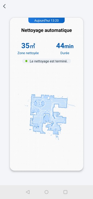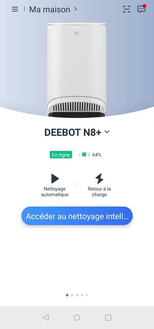 L'écran d'accueil de l'application offre un aperçu sur l'appareil en indiquant son statut, le niveau de charge avec un pourcentage, ainsi que la possibilité de démarrer un nettoyage ou de demander au robot de retourner à la base s'il est en cours de nettoyage. Deux raccourcis pratiques qui évitent de devoir accéder à la gestion complète de l'appareil.