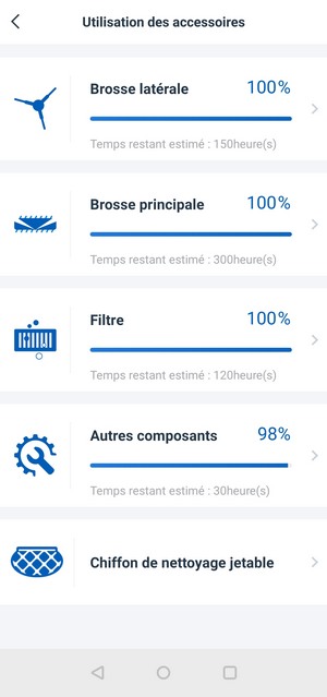 On pourrait évoquer aussi l'autonomie vis-à-vis des opérations de maintenance. L'application Ecovacs Home affiche une estimation quant à la durée de vie des différents éléments. Voici pour indication :