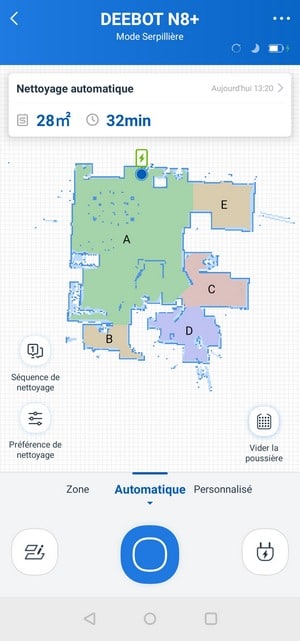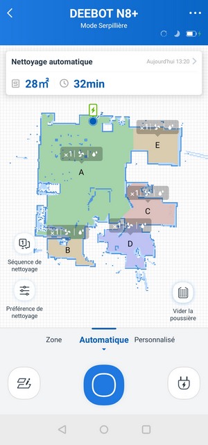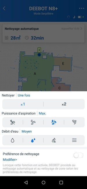 Le DEEBOT N8 propose quatre puissances d'aspiration différentes : silencieux, standard, fort et maximum. Il dispose aussi de quatre modes pour le débit d'eau : faible, moyen, haut et très fort. Pour le nettoyage, il y a le mode automatique bien sûr (il nettoie tout votre logement), mais aussi le mode zone qui permet de sélectionner sur la carte une ou plusieurs zones à nettoyer et enfin un mode personnalisé qui permet de nettoyer la zone dessinée sur la carte.