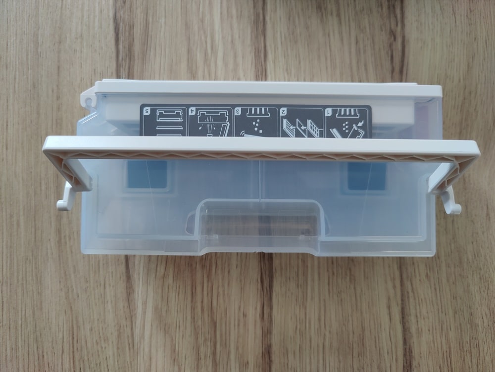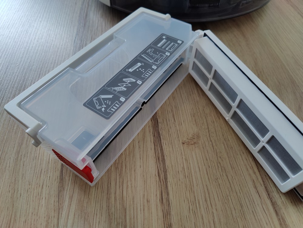 Un couvercle sur le dessus permet d'accéder au sac à poussière, qu'il faudra changer de temps en temps. L'aspiration de la poussière de l'aspirateur vers la base s'effectue par le dessous grâce à un système d'aspiration relativement puissant. À chaque fin de nettoyage, le robot viendra se positionner sur la base pour se recharger et vider son bac à poussière interne.