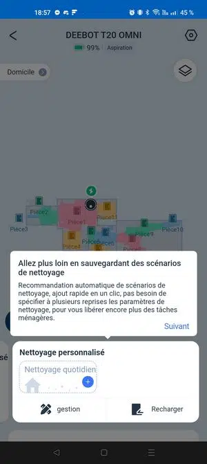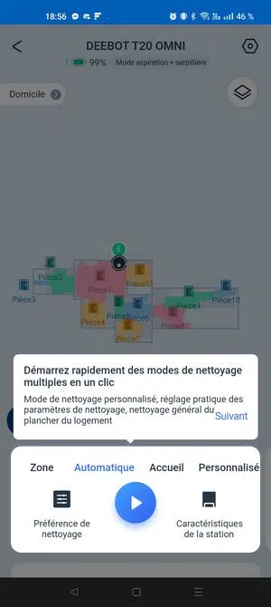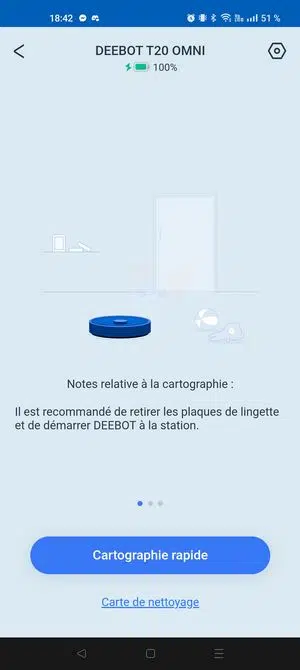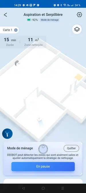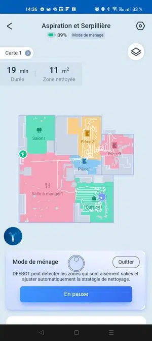 La première fois, le robot demande à effectuer une cartographie rapide de votre logement. Ceci ne prend que quelques minutes et permet de générer une première carte qui sera affinée par la suite lors d'un nettoyage complet. D'ailleurs, et c'est étonnant, la carte rapide générée par le robot était très loin de la réalité. J'ai supprimé la carte et j'ai relancé le processus, et cette fois-ci c'était bon. Je n'avais pas eu ce souci avec les autres modèles DEEBOT.