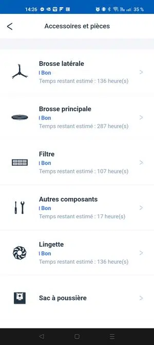- Maintenance pour accéder à l'état des différents accessoires et des pièces du robot