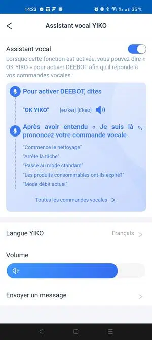Pour les adeptes du contrôle vocal, sachez que le DEEBOT est équipé d'un micro, mais aussi d'un haut-parleur, le tout étant exploité par un assistant vocal mis en au point par Ecovacs : Yiko. Il est intégré directement au robot et il prend en charge plus de commandes que les assistants Amazon Alexa et Google Assistant. Il prend en charge plusieurs langues, dont le français. Par contre, il reste encore un peu difficile à utiliser. Disons qu'il est un peu capricieux : il ne répond pas toujours à nos appels lorsqu'on le réveil avec la commande vocale "OK Yiko". Espérons qu'une mise à jour firmware permette de l'améliorer.