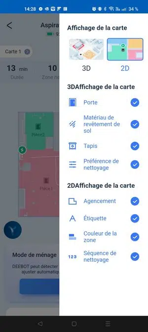 Pendant que le robot nettoie, son parcours s'affiche en temps réel sur la carte. Cette vue peut être personnalisée puisque l'on peut passer du mode 2D au mode 3D. En mode 3D, on peut afficher des éléments supplémentaires comme les portes et les tapis. Cette même carte pourra être personnalisée pour que le découpage des pièces soit au plus proche de la réalité.