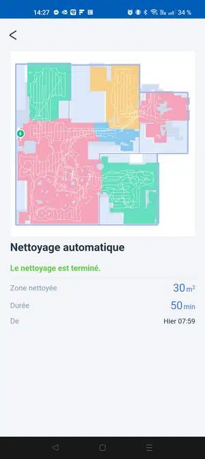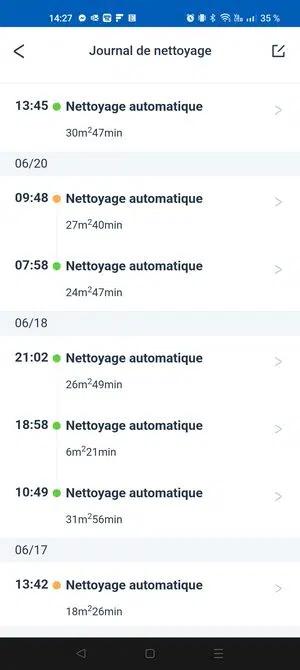 - Historique de nettoyage (date, heure, durée, surface nettoyée, et parcours du robot sur la carte)