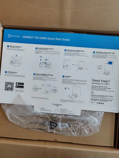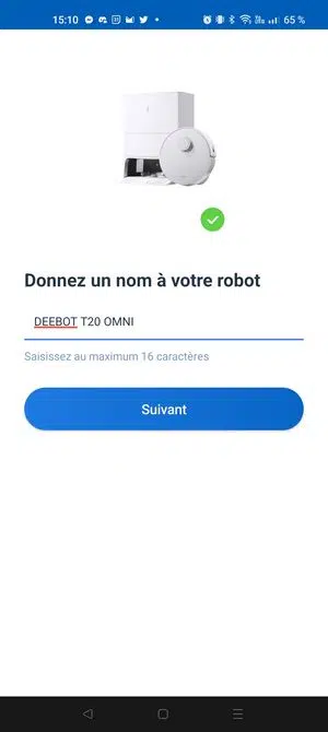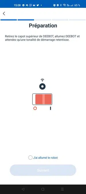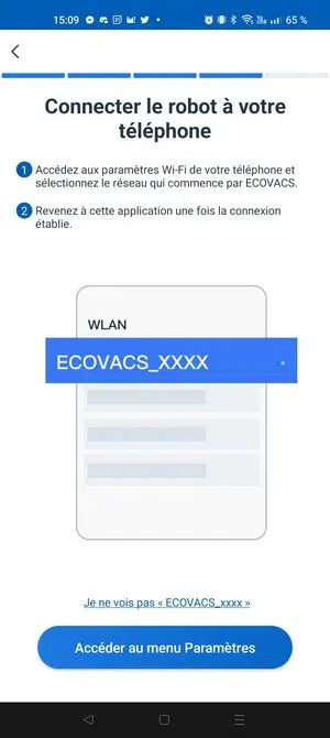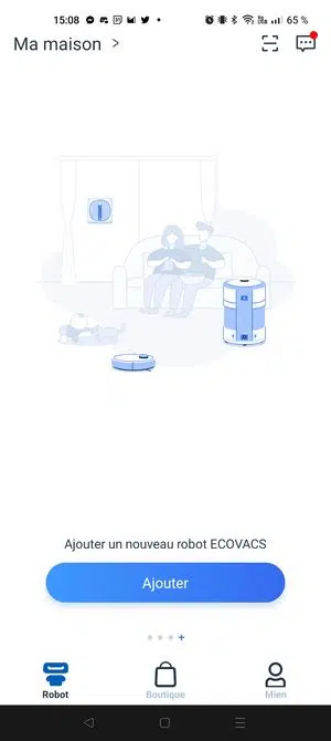 Une fois mis en place sur sa base et en charge, la mise en route du robot s'effectue à partir de son smartphone et de l'application Ecovacs Home. L'assistant de l'application permet d'initialiser le robot sans difficulté particulière. Pendant ce processus, il sera nécessaire de connecter le robot au Wi-Fi de votre maison à l'aide du QR code présent sur le robot.