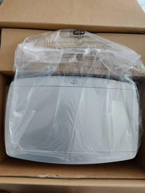 Commençons par nous intéresser à la station de charge, qui fait bien plus que simplement recharger le robot. Tout d'abord, parlons de son apparence : elle est entièrement blanche avec seulement la partie supérieure qui en gris argent, elle est particulièrement imposante ! Pour être plus précis, voici les dimensions de la base : 448 x 430 x 578 mm ! Avec une telle taille, difficile de passer inaperçu : c'est un point à prendre en considération au moment de faire votre achat. Sur le dessus de la base, il y a un bouton qui sert à démarrer, suspendre ou reprendre le nettoyage.