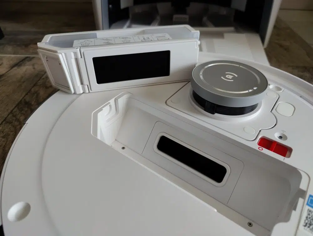 Si l'on soulève le capot du robot, on peut accéder au réservoir à poussières : ce que l'on ne devrait pas faire souvent puisque le robot se vide dans la base de façon automatique. Toutefois, ce sera utile pour changer le filtre d'ici quelques mois... C'est aussi en retirant le capot que l'on accède au bouton de réinitialisation et au bouton de gestion de l'alimentation. J'en profite pour préciser qu'il n'y a pas de réservoir d'eau dans le robot : l'eau est stockée uniquement dans la base.
