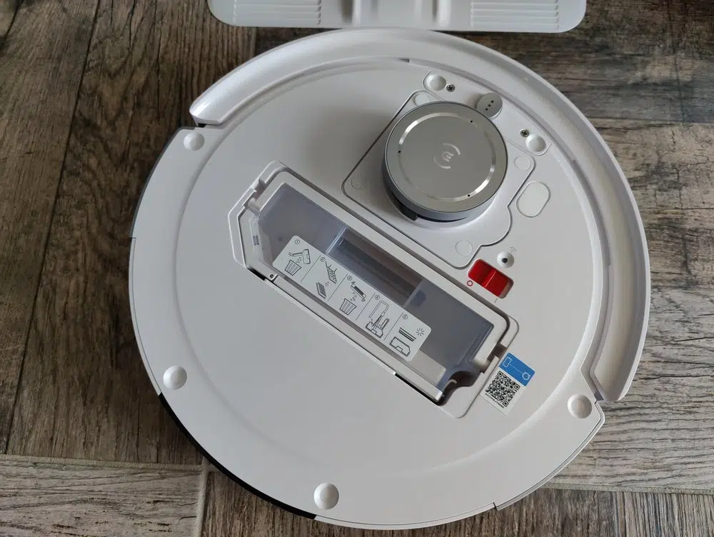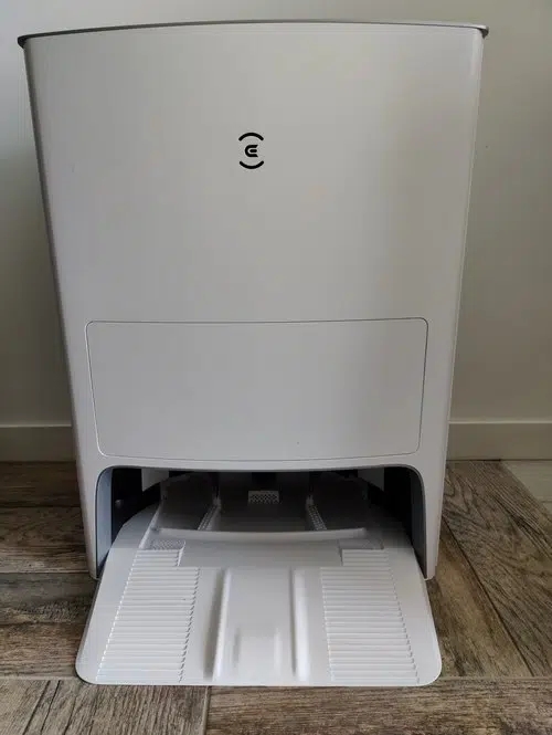 Déjà, parce que le robot pourra vider sa poussière dans le sac à poussière de 3 litres qui est intégré à la station et auquel on accède en appuyant sur un bouton caché au niveau du bac de nettoyage.