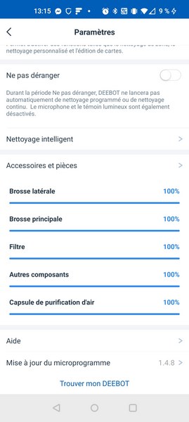 Nous retrouvons aussi toutes les fonctions habituelles que j'ai pu présenter dans mes différents tests Ecovacs : suivi de l'usure des accessoires (avec un pourcentage précis), accès à l'historique des nettoyages (avec à chaque fois la durée, la surface nettoyée ainsi que la carte avec le parcours précis du robot), la gestion des commandes vocales (choix de la langue tout en sachant que le français est inclus et la gestion du volume), planification d'un nettoyage, mode "Ne pas déranger", etc.