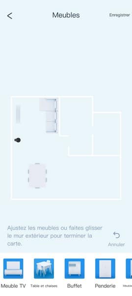 Ensuite, l'utilisateur peut personnaliser cette carte : il est possible de modifier les cloisons du plan et d'ajouter ou supprimer du mobilier. Par exemple, vous pouvez ajouter le buffet de votre salle à manger sur la carte. En ce qui me concerne, le robot s'est un peu trompé sur le positionnement des cloisons sur une partie du logement, mais les meubles sont correctement placés.