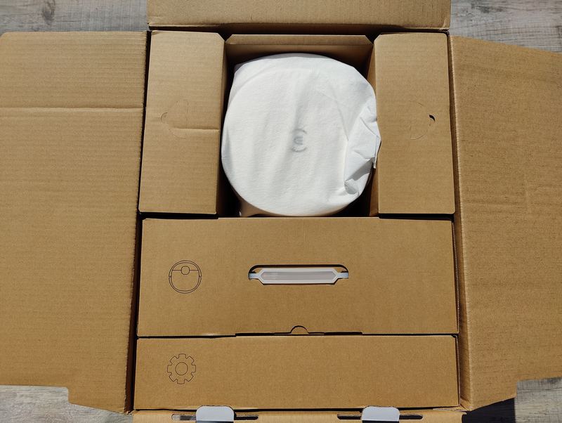 À partir du moment où l'aspirateur robot est accompagné par une station de vidage automatique, comme c'est le cas ici, on se retrouve avec un carton imposant. En tout cas, chaque élément est à sa place et bien protégé. L'aspirateur robot est dans son propre carton.