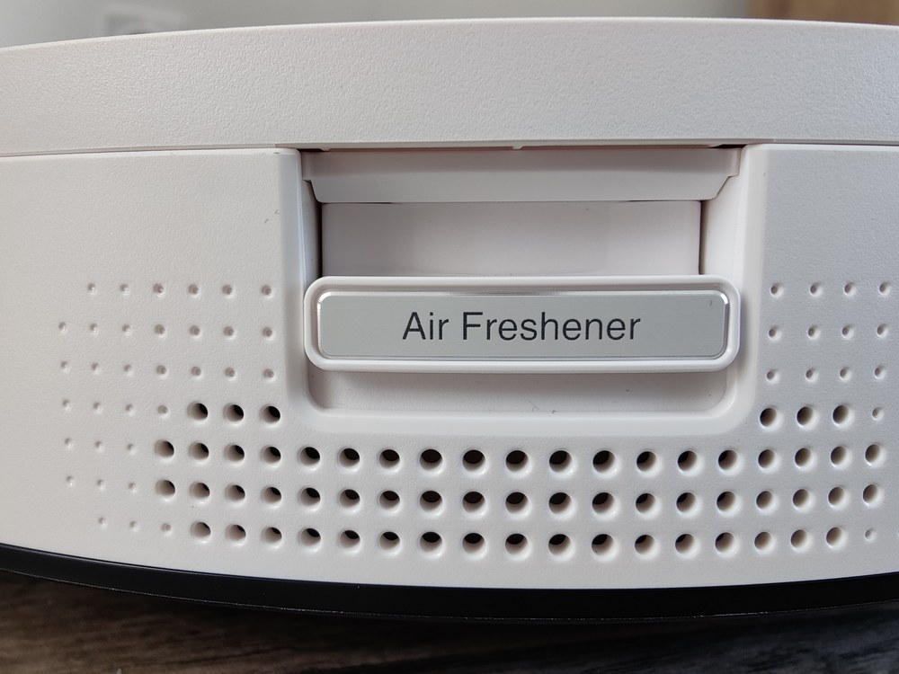 La capsule de parfum fournie se positionne au sein du système Air Freshener, ce dernier contient un ventilateur. Il y a plusieurs parfums disponibles : jacinthe sauvage, bergamote et lavande, ainsi que concombre et écorce de chêne. Je ne suis pas parvenu à trouver où acheter une capsule de parfum pour le moment.