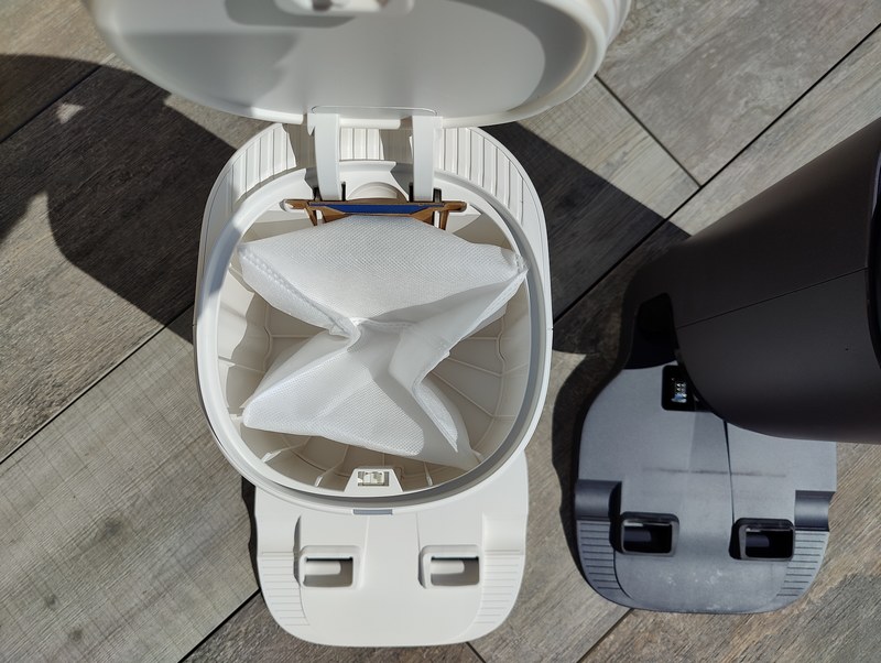La station de vidage automatique du DEEBOT T9+ est de couleur "blanc perle", tandis qu'elle était grise avec le DEEBOT T8+. Sinon pour le reste, la station est restée identique et pour cause la station du T8 peut fonctionner avec le T9, et inversement. Un couvercle sur le dessus de la station d'auto-vidage permet d'accéder au sac à poussière. La capacité du sac est de 2,5 litres : de quoi tenir 30 jours si vous avez des animaux. Sans poils d'animaux, on peut tenir plusieurs mois.