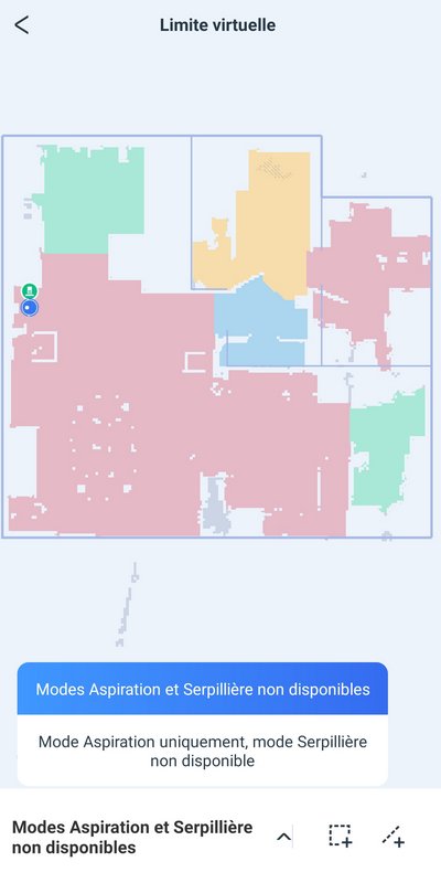 La carte est toujours modifiable pour ajouter des limites virtuelles ou des zones à ne pas laver (aspirer seulement). Cela s'effectue à partir de l'application et on peut créer plusieurs zones, de la taille que l'on souhaite.