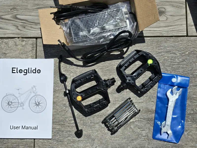 Ce vélo électrique est livré avec un chargeur et son câble d'alimentation. Il y a bien une sonnette, déjà installée sur le guidon. Eleglide n'a pas inclus d'accessoires additionnels.