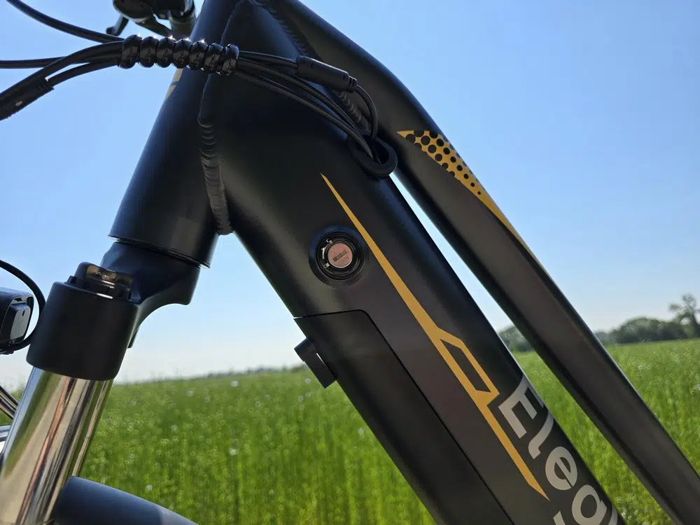 Ce modèle est proposé en un seul coloris, qui est un gris assez foncé. Il en va de même pour la version C1, disponible seulement en bleue. Le cadre renforcé est en alliage d'aluminium. Les finitions sont propres et les soudures sont discrètes, car elles sont assez fines. Des éléments esthétiques, jaunes et blancs, sont présents sur le cadre et les jantes des roues. Le vélo est estampillé "Eleglide" à plusieurs emplacements. Ces éléments améliorent franchement l'esthétique générale du vélo, et ce dernier a une belle allure.