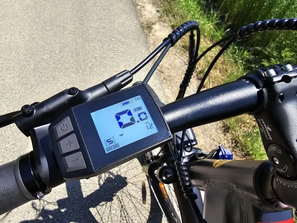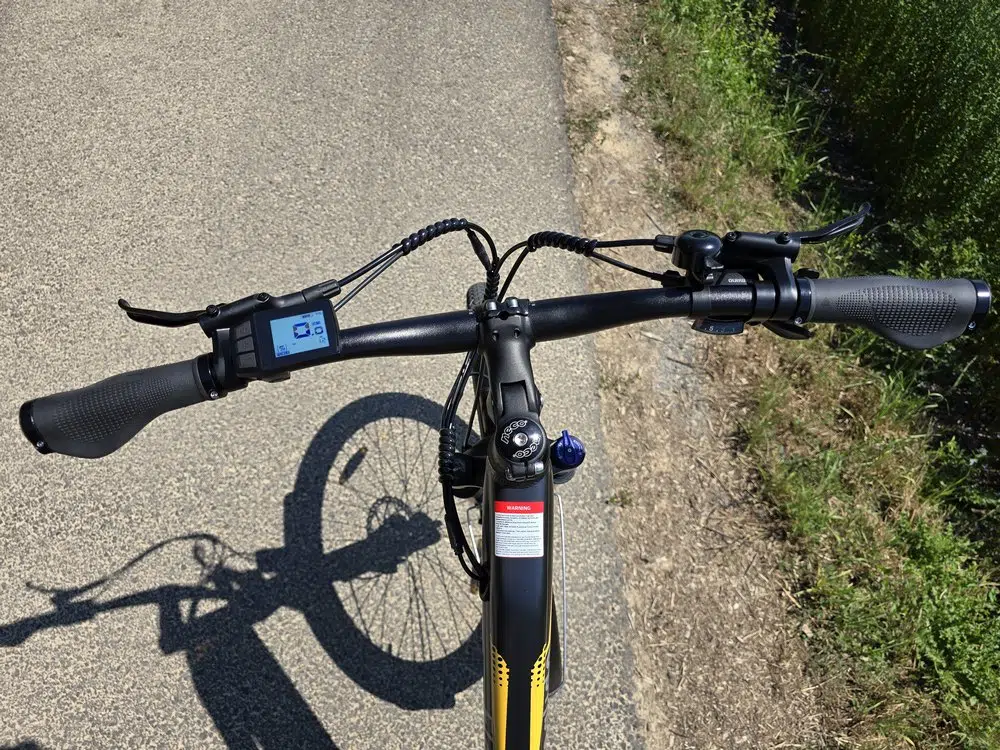 La prise en main du vélo passe par la découverte du guidon et la maitrise des différents éléments qui s'y trouve. Au-delà des manettes pour la gestion des vitesses et des poignées de freins, nous avons une sonnette sur la droite et un écran LCD monochrome de 1,8 pouce sur la gauche. Il est accompagné, sur sa gauche, par trois boutons pour allumer/éteindre le vélo, mais aussi augmenter ou diminuer le niveau d'assistance électrique.