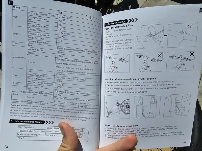 Eleglide a inclus tous les outils nécessaires au montage, mais sachez que ce vélo est déjà partiellement monté. L'assemblage est relativement rapide, puisqu'il faut compter entre 30 et 45 minutes. Pour ma part, j'ai mis 40 minutes à effectuer le montage. Pour le montage, nous pouvons compter sur l'aide de la notice, en français, et relativement précise. Elle est d'une bonne aide.