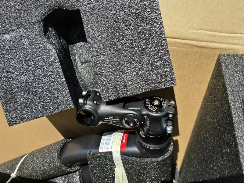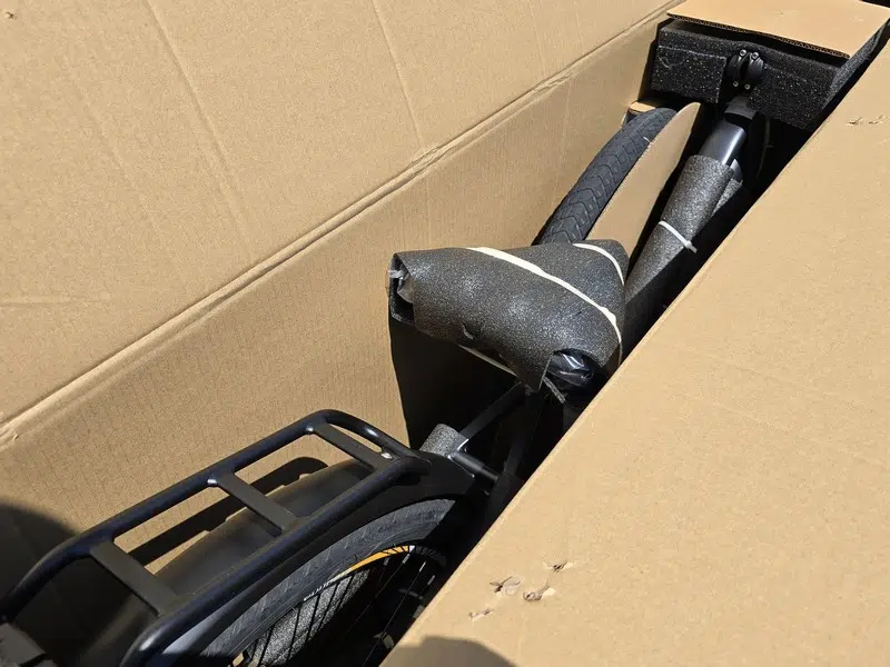 Le colis est arrivé en bon état à mon domicile, et le matériel n'est pas abimé bien qu'il y ait quelques marques sur le carton. Ceci n'est pas un hasard : à l'intérieur du carton, Eleglide a mis le paquet au niveau des mousses de protection. Ainsi, les différentes parties du vélo sont correctement protégées contre les chocs.