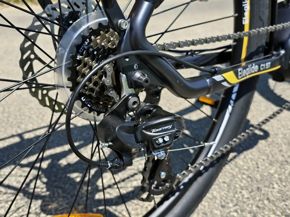 Le niveau d'assistance 5 est limité à 25 km/h, ce qui est conforme à la réglementation française en vigueur. Le tout est complété par un mode marche à 6 km/h. Vous pouvez rouler au-delà de 25 km/h, mais ce sera à la force de vos mollets. Néanmoins, ce n'est pas aisé puisqu'il n'y a qu'un seul plateau et 7 vitesses (avec un dérailleur Shimano de la série Tourney). Ceci donne l'impression de rapidement pédaler dans le vide, et si vous atteignez 30/33 km/h, ce sera déjà bien.