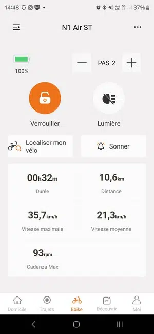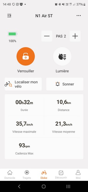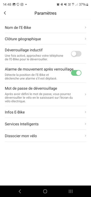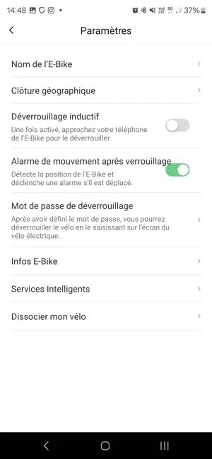 - Le verrouillage / déverrouillage du vélo, avec une alarme de mouvement. Si votre vélo est verrouillé et que quelqu'un le manipule (même légèrement), l'alarme va sonner. Il y a une fonction de geofencing pour autoriser les mouvements sur une zone géographique spécifique. C'est une fonction antivol très intéressante.
