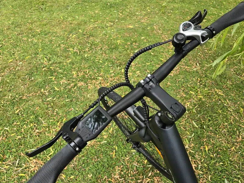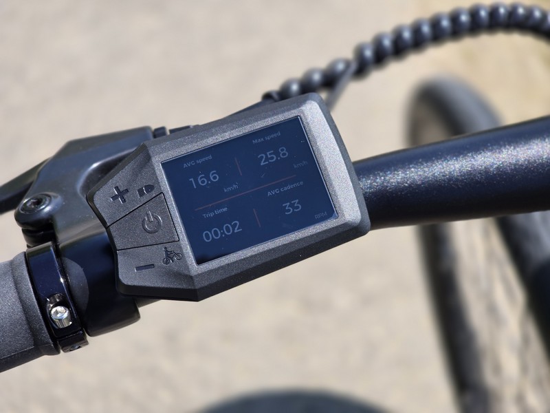 Intéressons-nous au guidon, puisqu'il contient de nombreux éléments : poignées, commandes de vitesses, sonnette, et surtout l'écran LCD ! Ce dernier reste d'ailleurs lisible même en plein soleil. Il affiche la vitesse en temps réel (km/h) et le niveau d'assistance. Il affiche aussi des statistiques telles que la distance totale parcourue, la vitesse moyenne ou encore la vitesse maximale. Les boutons "+" et "-" servent à gérer le niveau d'assistance (de 1 à 5), mais aussi à gérer l'éclairage et à utiliser le mode marche (le vélo avance très lentement, ce qui est utile si vous marchez à côté du vélo, car vous n'aurez pas d'effort à fournir).