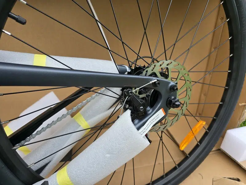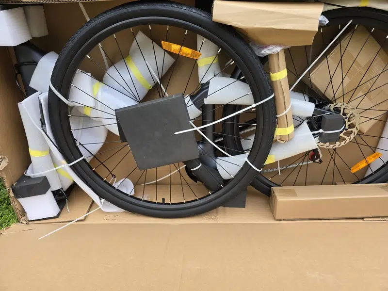 Le carton est arrivé en parfait état, et comme à chaque fois, chez ENGWE, nous avons un packaging simple, mais le matériel à l'intérieur est parfaitement protégé. De nombreuses pousses protègent le cadre du vélo et toutes les parties fragiles. Tous les éléments sont attachés les uns aux autres. L'ouverture du carton donne un aperçu plus précis sur les éléments qui seront à assembler.
