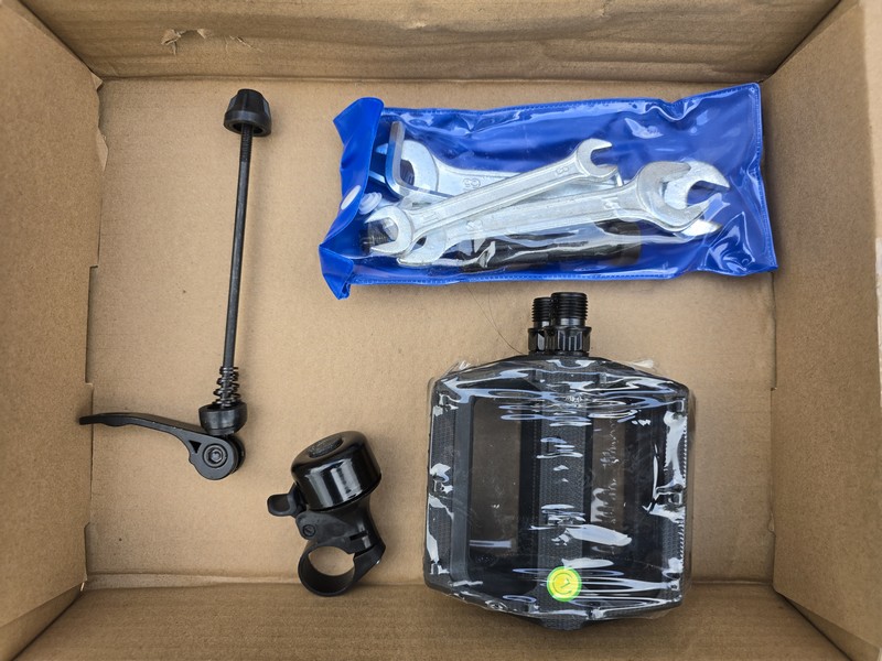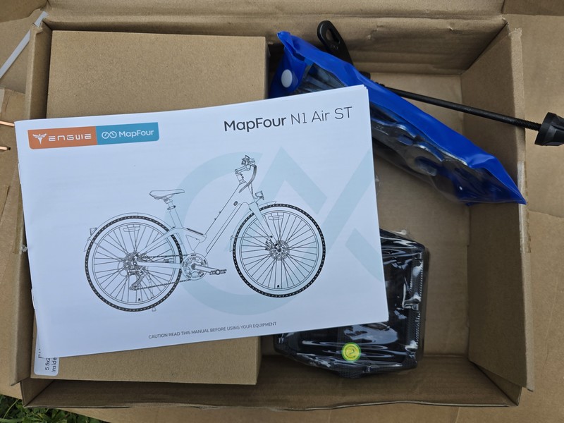 Ce vélo reçu en carton est donc à assembler ! Pour cela, ENGWE a tout prévu : une notice explicative et une trousse avec tous les outils nécessaires au montage. Le petit carton qui contient les outils renferme aussi les pédales, la sonnette et le chargeur. Ce modèle est livré sans porte-bagage et sans porte-gourde.