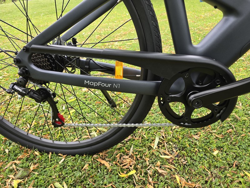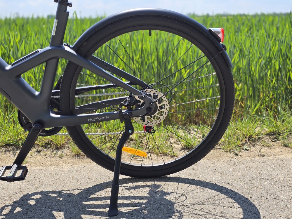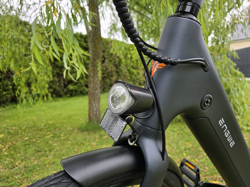 Le cache-chaîne, discret, mais efficace, évite les salissures sur les vêtements à cause d'un éventuel frottement et donne un aspect haut de gamme de ce vélo. L’éclairage a une particularité intéressante : le phare LED avant est alimenté par la batterie, tandis que l'éclairage arrière est à énergie solaire !