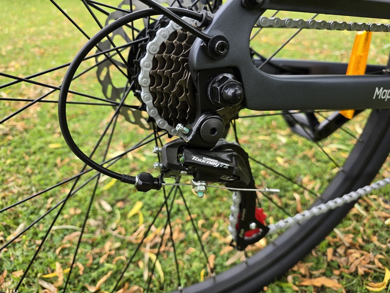 La transmission est assurée par un dérailleur Shimano Tourney et une poignée Shimano avec 7 vitesses. Il n'y a qu'un seul plateau, comme sur les autres modèles de chez ENGWE que j'ai eu l'occasion de tester. Contrairement à d'autres modèles, celui-ci n'a pas de barre métallique pour protéger le dérailleur des chocs : probablement une question d'esthétique.