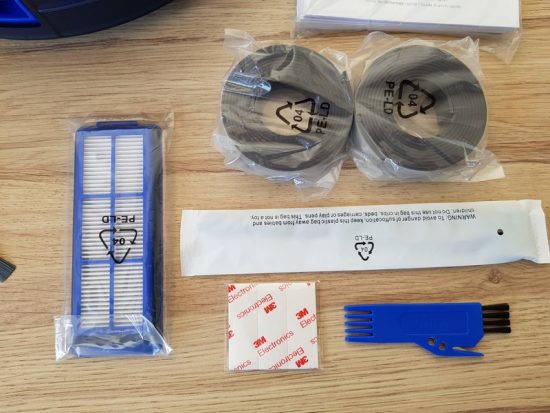 Cet aspirateur robot est livré avec une station de charge (et son alimentation) ainsi que différents accessoires : deux filtres, deux paires de balais latéraux, une télécommande (avec 2 piles AA), un outil pour l'entretien, et deux bandes magnétiques (de 2 mètres) pour la délimitation de zones.