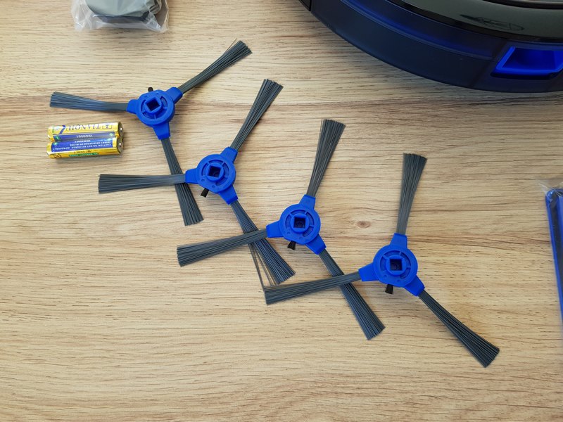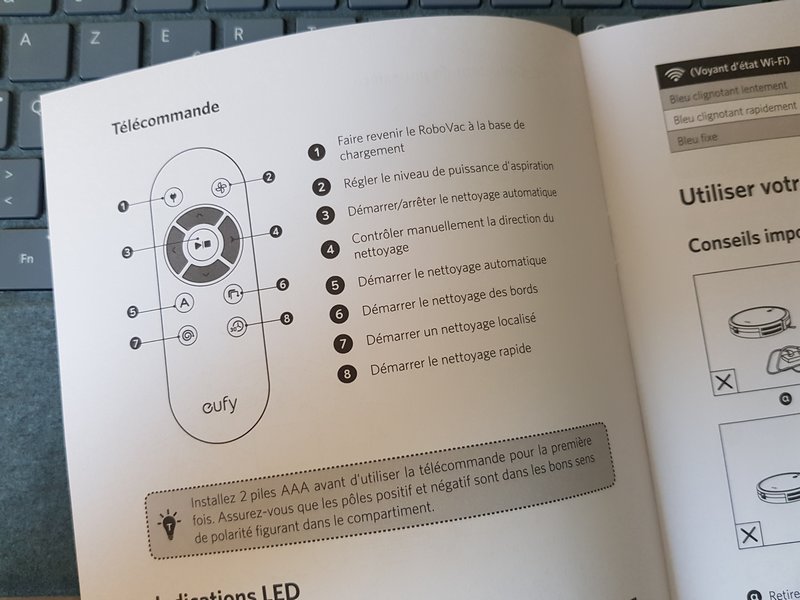 En complément de la télécommande et des brosses montées sur l'appareil, nous retrouvons des brosses de rechange ainsi qu'un filtre de rechange, avec un outil de nettoyage en complément. La notice quant à elle intègre toutes les informations nécessaires au nettoyage de l'appareil, et notamment les cycles de remplacement des pièces du robot.