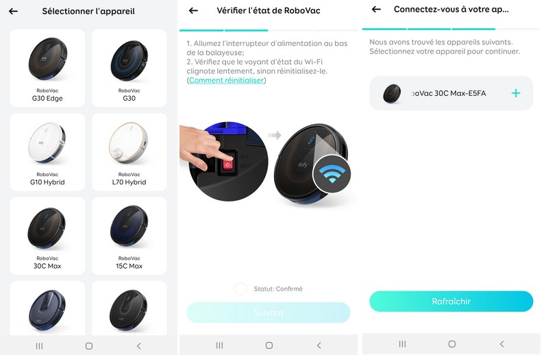 Après avoir installé la base de l'aspirateur robot, il faut allumer l'interrupteur sous le robot avant de le positionner sur la base. Suite à ça, il va s'allumer et être en attente d'une connexion... C'est ce qu'il faut initialiser à partir du smartphone et de l'application EufyHome. La procédure d'ajout d'un nouveau robot est simple à partir de cette application et prendra 2 minutes... Il suffit de se laisser guider.
